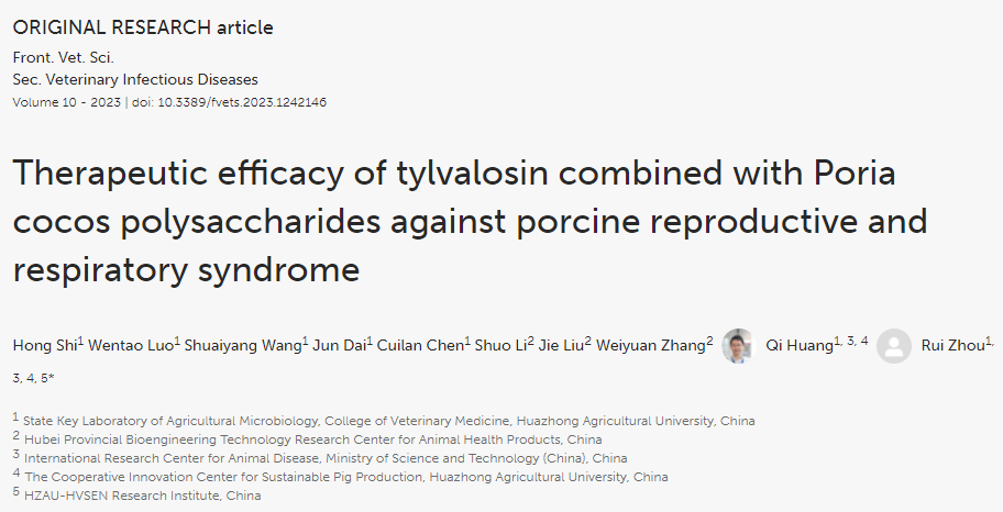 近日,武漢回盛生物科技股份有限公司 (回盛生物)與華中農(nóng)業(yè)大學周銳教授團隊以“Therapeutic efficacy of tylvalosin combined with Poria cocos polysaccharides against porcine reproductive and respiratory syndrome” 為題的研究論文在獸醫(yī)學國際權威期刊《Frontiers in Veterinary Science》( 獸醫(yī)科學前沿 )上正式發(fā)表。該論文是回盛生物“穩(wěn)藍增免方案” 的理論和實驗基礎,為豬藍耳病防控領域的發(fā)展再添強勁技術支撐。