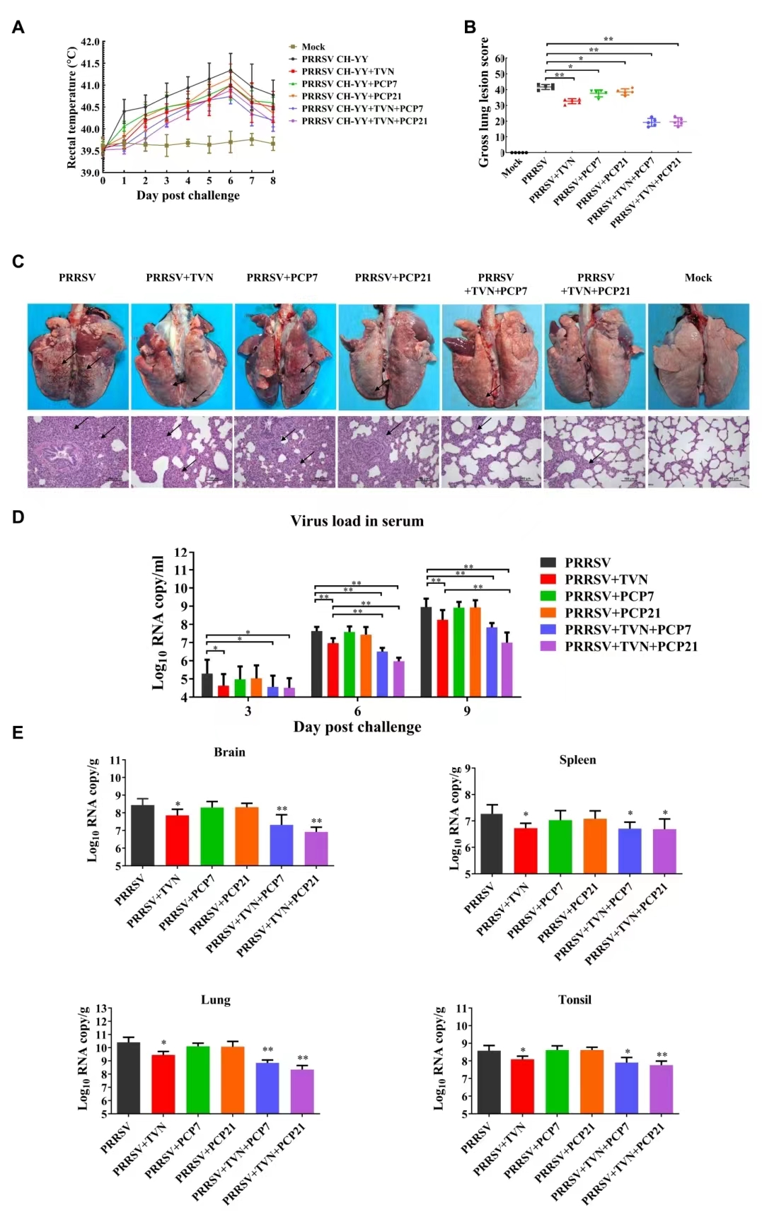 靶動物感染試驗進一步證明:治嗽靜能顯著降低 HP-PRRSV和NADC30樣毒株感染豬的病毒血癥和組織病毒載量,減輕PRRSV感染導致的炎癥反應和肺部損傷,抑制PRRSV感染后的體溫升高,降低豬的日增重損失 ;茯苓多糖(衛(wèi)免)可以修復PRRSV感染導致的豬免疫抑制,減輕炎癥反應和肺部損傷,降低體溫反應和日增重損失;將治嗽靜與衛(wèi)免聯(lián)用,對藍耳病的防治效果顯著優(yōu)于單獨使用,顯示出“1+1>2”的效果。
