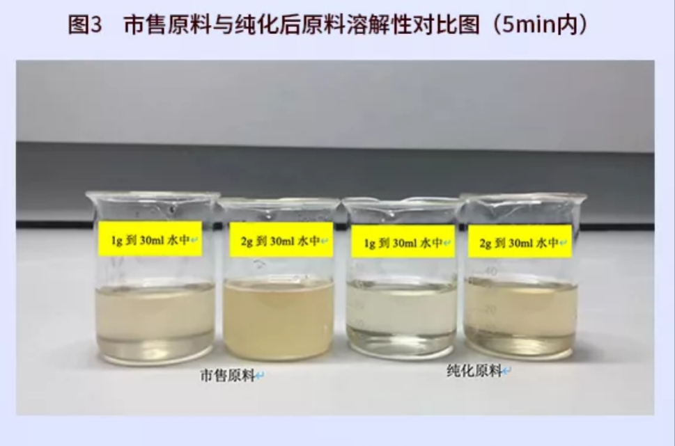 在原泰萬菌素生產(chǎn)工藝基礎(chǔ)上增加高效吸附絮凝純化工藝,純度更高,泰萬菌素A組分峰面積由85.9%升高至87.7%,純度更高,且雜質(zhì)由原來的17個(gè)減少到14個(gè),同時(shí),純化后的原料溶解度更高,溶解更快,回盛原料1g、2g30ml水中攪拌,分別于2min3min后溶液呈澄清透明。