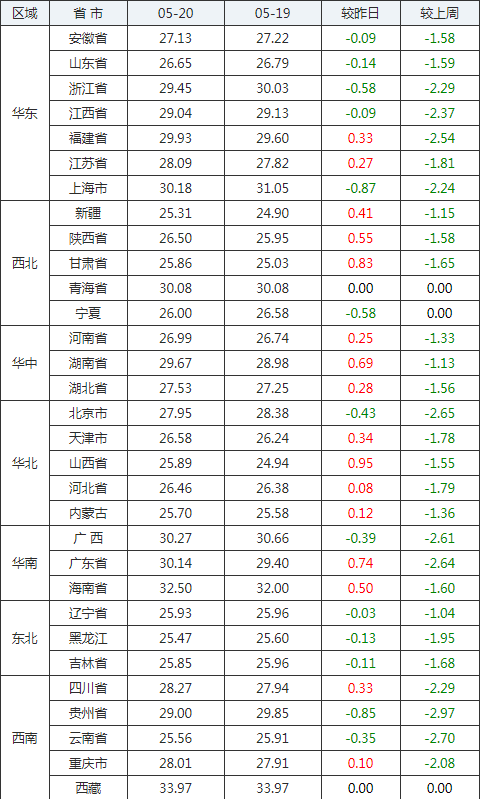 2020年05月20日全國外三元生豬價(jià)格行情漲跌表