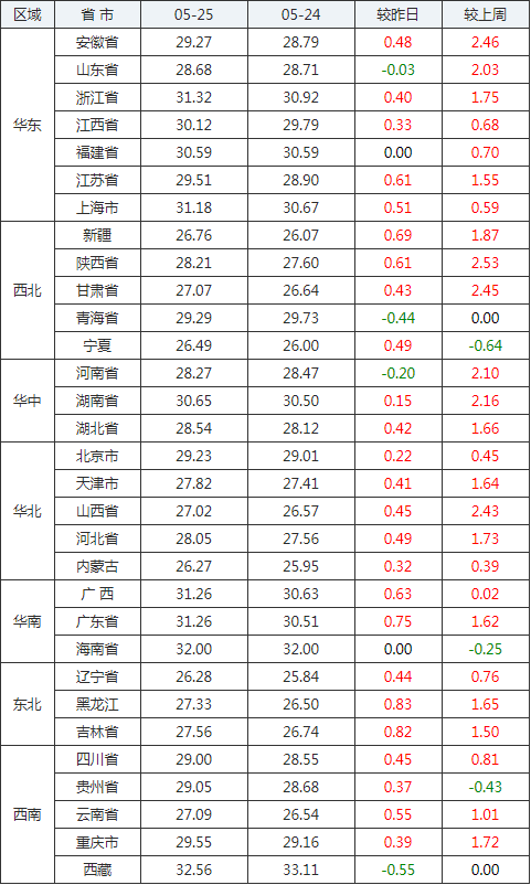 2020年05月25日全國(guó)外三元生豬價(jià)格行情漲跌表