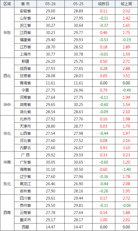 2020年05月26日全國內(nèi)三元生豬價格行情漲跌表