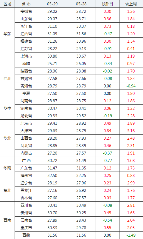 2020年05月29日全國外三元生豬價(jià)格行情漲跌表