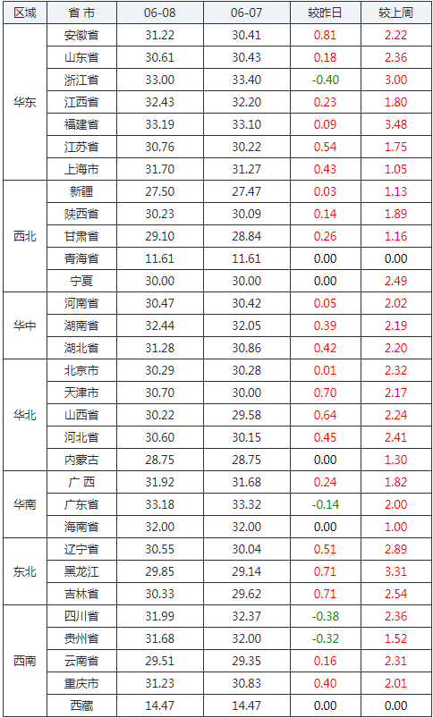 2020年06月08日全國內(nèi)三元生豬價格行情漲跌表