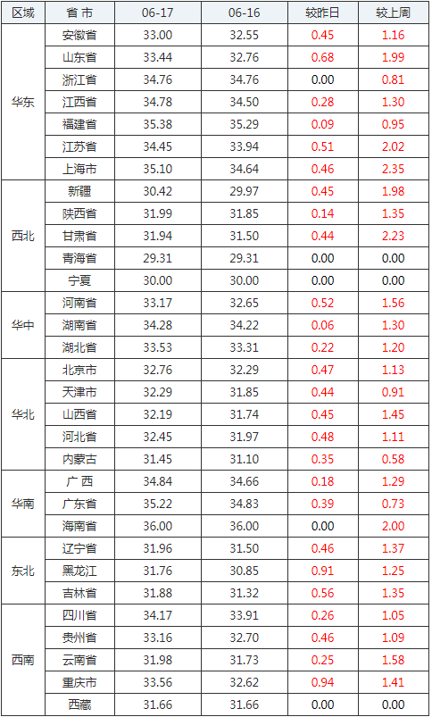 2020年06月17日全國外三元生豬價格行情漲跌表