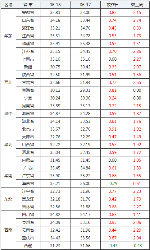 2020年06月18日全國外三元生豬價格行情漲跌表