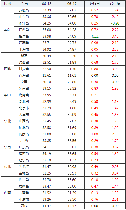 2020年06月18日全國內三元生豬價格行情漲跌表