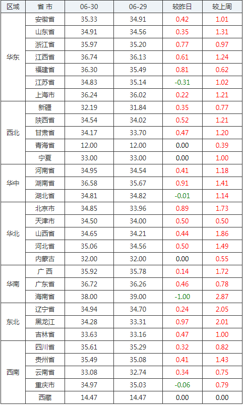 2020年06月30日全國(guó)內(nèi)三元生豬價(jià)格行情漲跌表