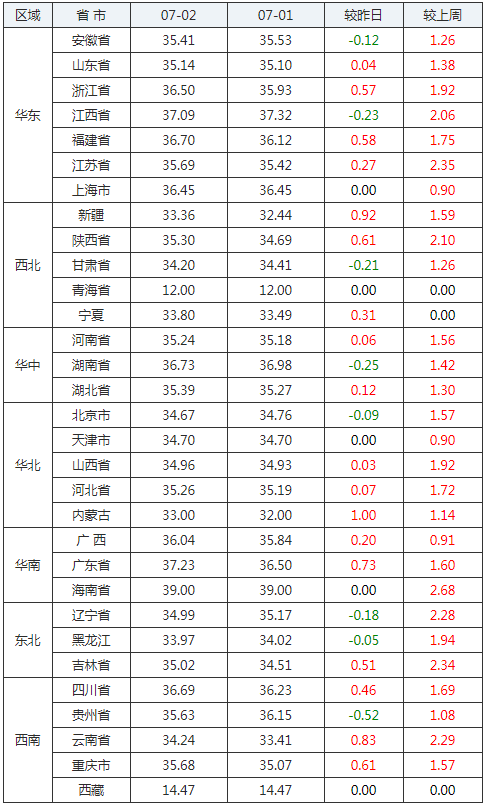 2020年07月02日全國內(nèi)三元生豬價格行情漲跌表