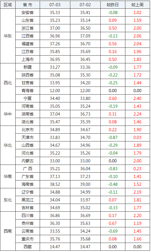 2020年07月03日全國內(nèi)三元生豬價(jià)格行情漲跌表