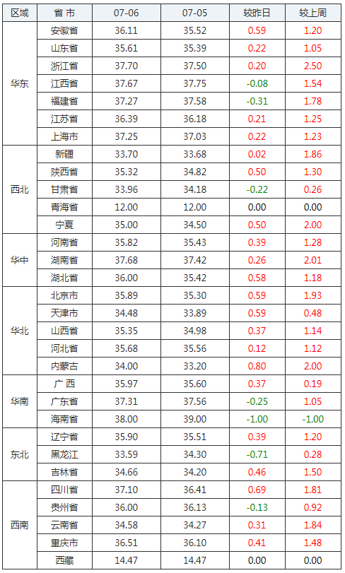 2020年07月06日全國內(nèi)三元生豬價(jià)格行情漲跌表