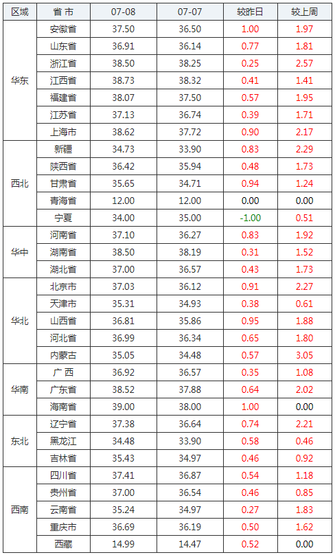 2020年07月08日全國內(nèi)三元生豬價(jià)格行情漲跌表