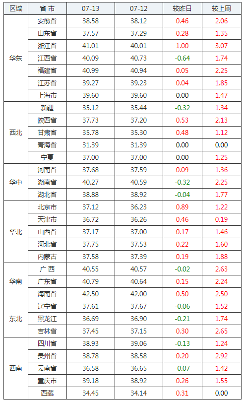 2020年07月13日全國外三元生豬價格行情漲跌表