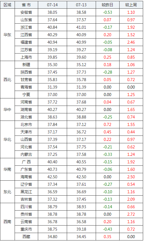 2020年07月14日全國外三元生豬價格行情漲跌表