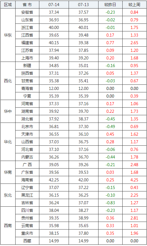 2020年07月14日全國內(nèi)三元生豬價格行情漲跌表