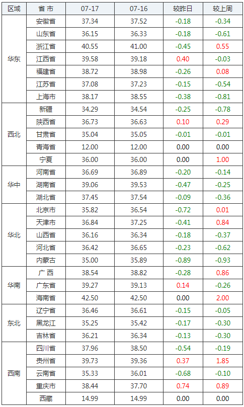 2020年07月17日全國(guó)內(nèi)三元生豬價(jià)格行情漲跌表