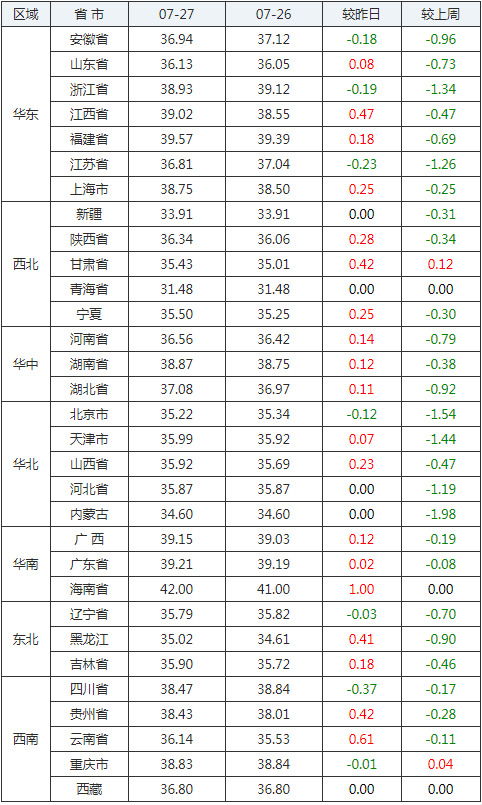 2020年07月27日全國外三元生豬價格行情漲跌表