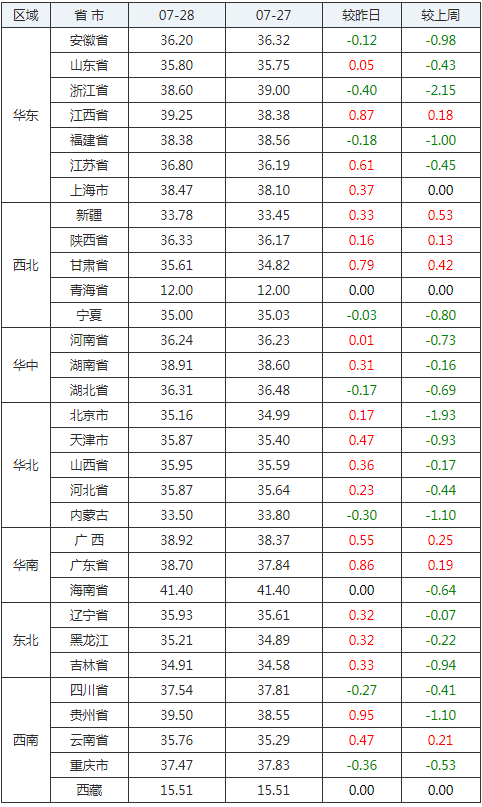 2020年07月28日全國內(nèi)三元生豬價格行情漲跌表