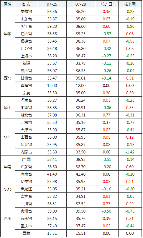 2020年07月29日全國(guó)內(nèi)三元生豬價(jià)格行情漲跌表