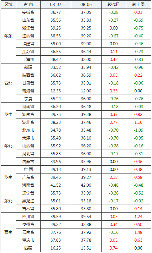 2020年08月07日全國內(nèi)三元生豬價(jià)格行情漲跌表
