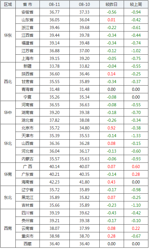 2020年08月11日全國(guó)內(nèi)三元生豬價(jià)格行情漲跌表