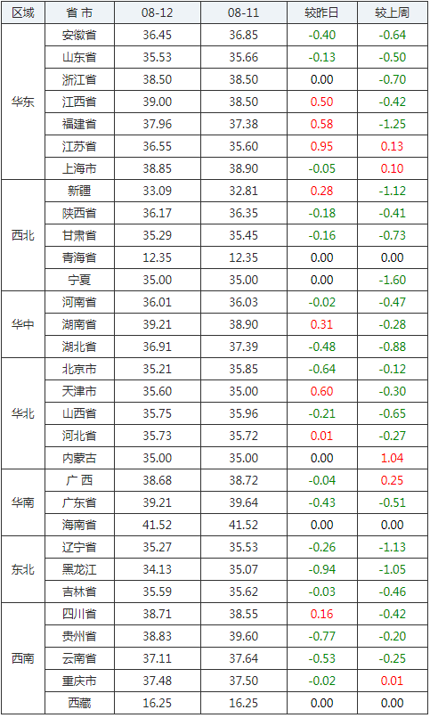 2020年08月12日全國內(nèi)三元生豬價(jià)格行情漲跌表