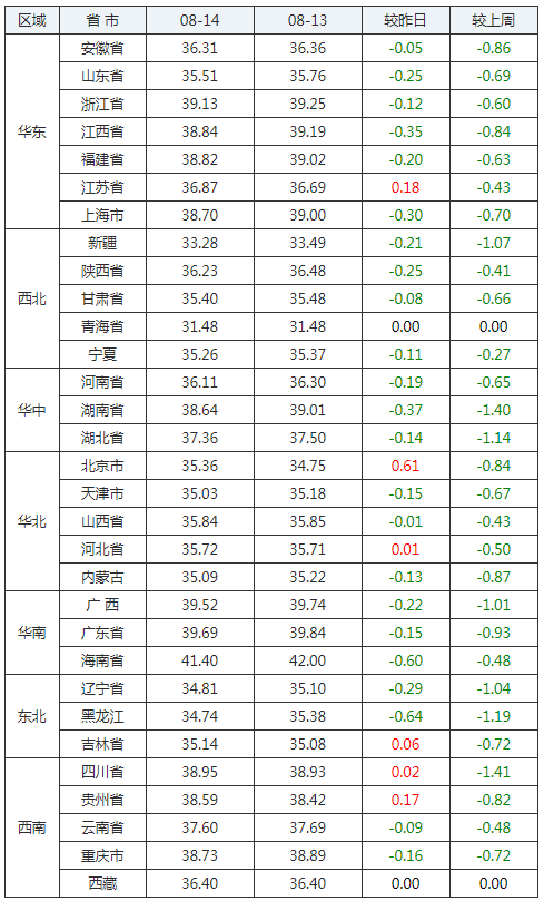 2020年08月14日全國外三元生豬價格行情漲跌表