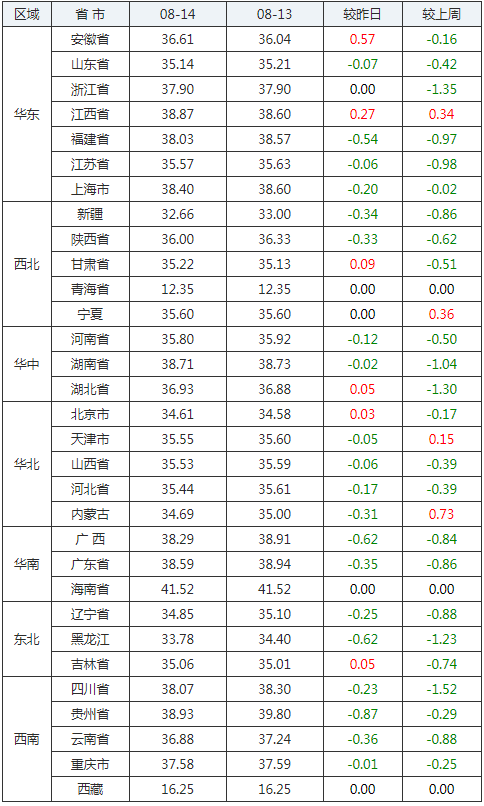 2020年08月14日全國內(nèi)三元生豬價格行情漲跌表
