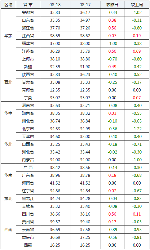 2020年08月18日全國(guó)內(nèi)三元生豬價(jià)格行情漲跌表