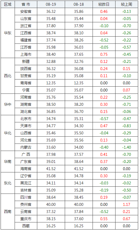 2020年08月19日全國內(nèi)三元生豬價格行情漲跌表